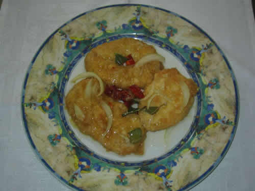 Patatas peladas, "atortadas", rebozadas y fritas y aliñadas con escabeche suave en vinagre.