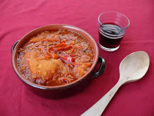 Estofado con patatas, pimentón y pimiento seco.