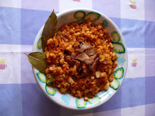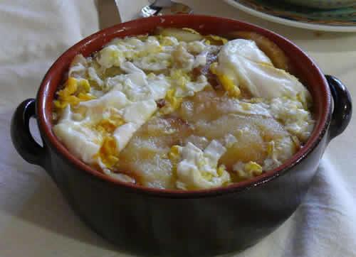 Patatas cocidas machacadas con una cuchara "jerreña" y con pimentón, ajo, aceite y panceta.