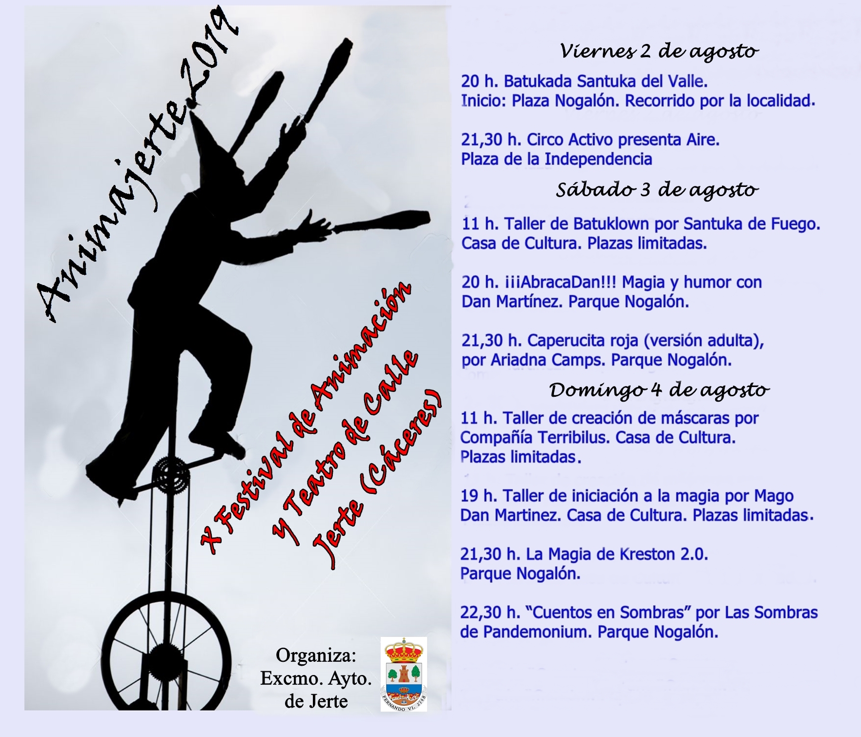 Programacion del X FESTIVAL DE ANIMACION Y TEATRO DE CALLE en Jerte para los dias 2, 3 y 4 de Agosto.