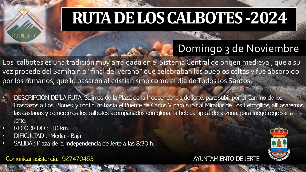 RUTA DE LOS CALBOTES 2024 30 octubre 2024 Domingo 3 de noviembre Salida: Plaza de la Independencia de Jerte Dificultad: Media-Baja Recorrido: 10km. Comunicar asistencia: 927470453