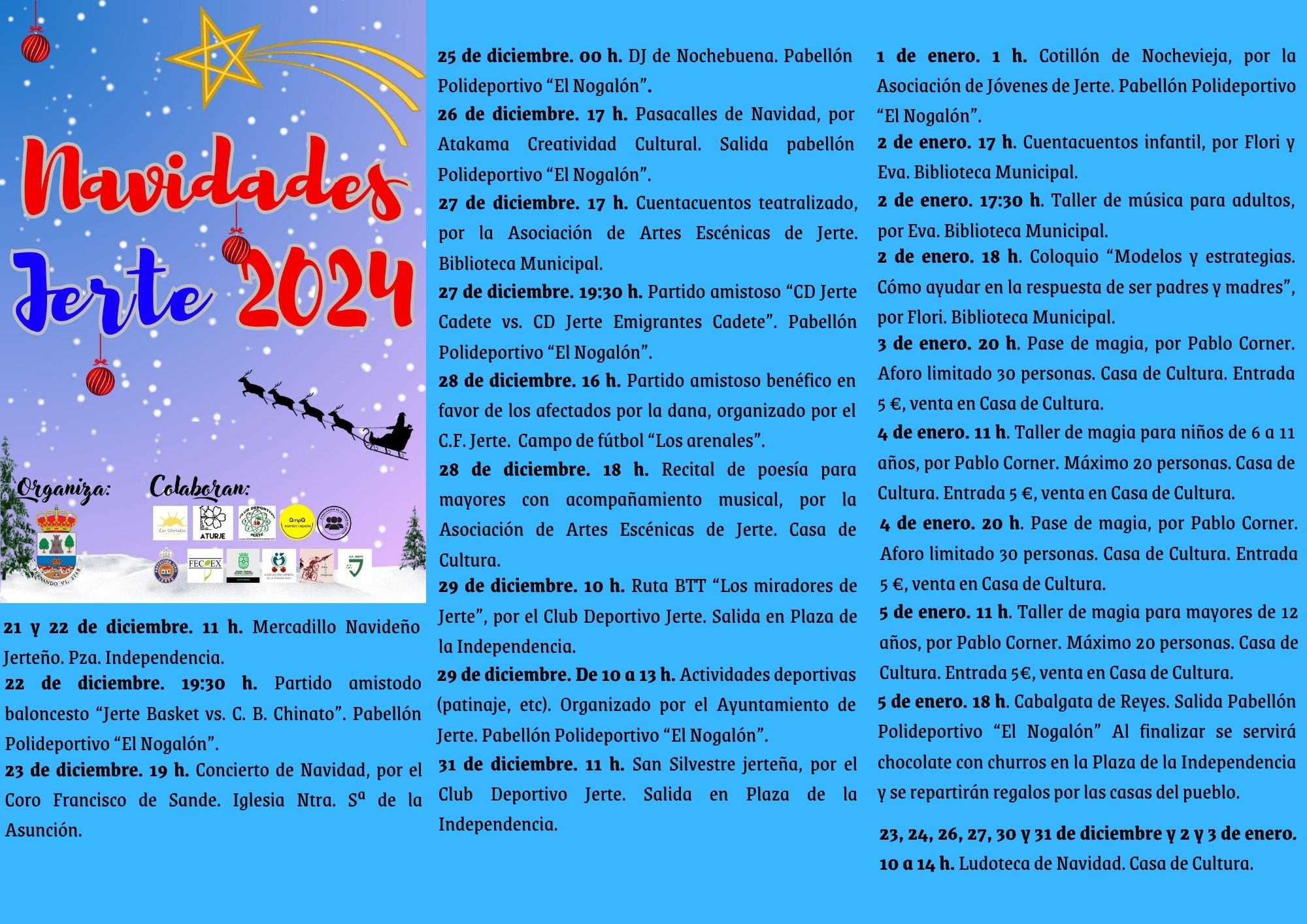 18 h. Cabalgata de Reyes. Salida desde el Pabellón Polideportivo "El Nogalón". Al finalizar se servirá chocolate con churros en la Plaza de la Independencia y se repartirán regalos por las casas del pueblo.