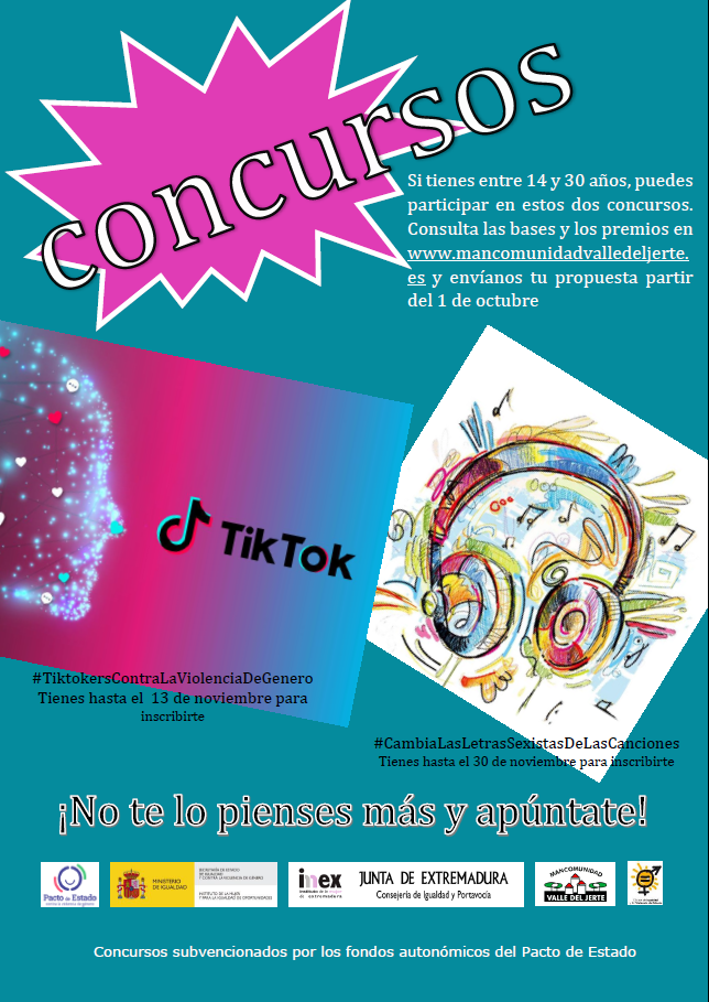 Con motivo del Proyecto de sensibilización y prevención de la violencia de género en Valle del Jerte, subvencionado por los fondos autonómicos del Pacto de Estado, la Oficina de Igualdad de la Mancomunidad del Valle del Jerte, en su compromiso en la lucha contra la violencia de género quiere invitar a todos los jóvenes a participar en dos concursos, uno de tik tok y otro musical, que han creado para especialmente para vosotros. ANIMATE Y PARTICIPA!!!!