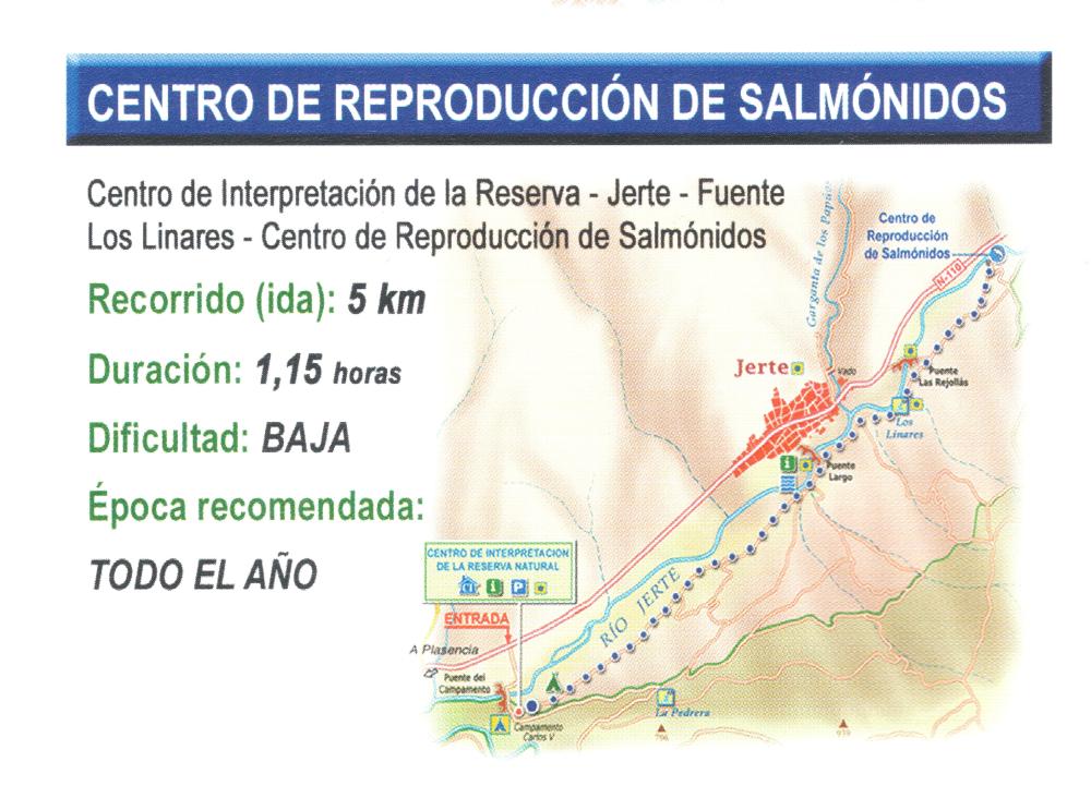 Salida desde el pueblo de Jerte, cruzando el puente largo que se encuentra al lado del parque el nogalón. Cruza el puente largo y gira a la izquierda, el recorrido se realiza por una pista encementada y siguiendo la señalización de Centro de Interpretación de Salmónidos.